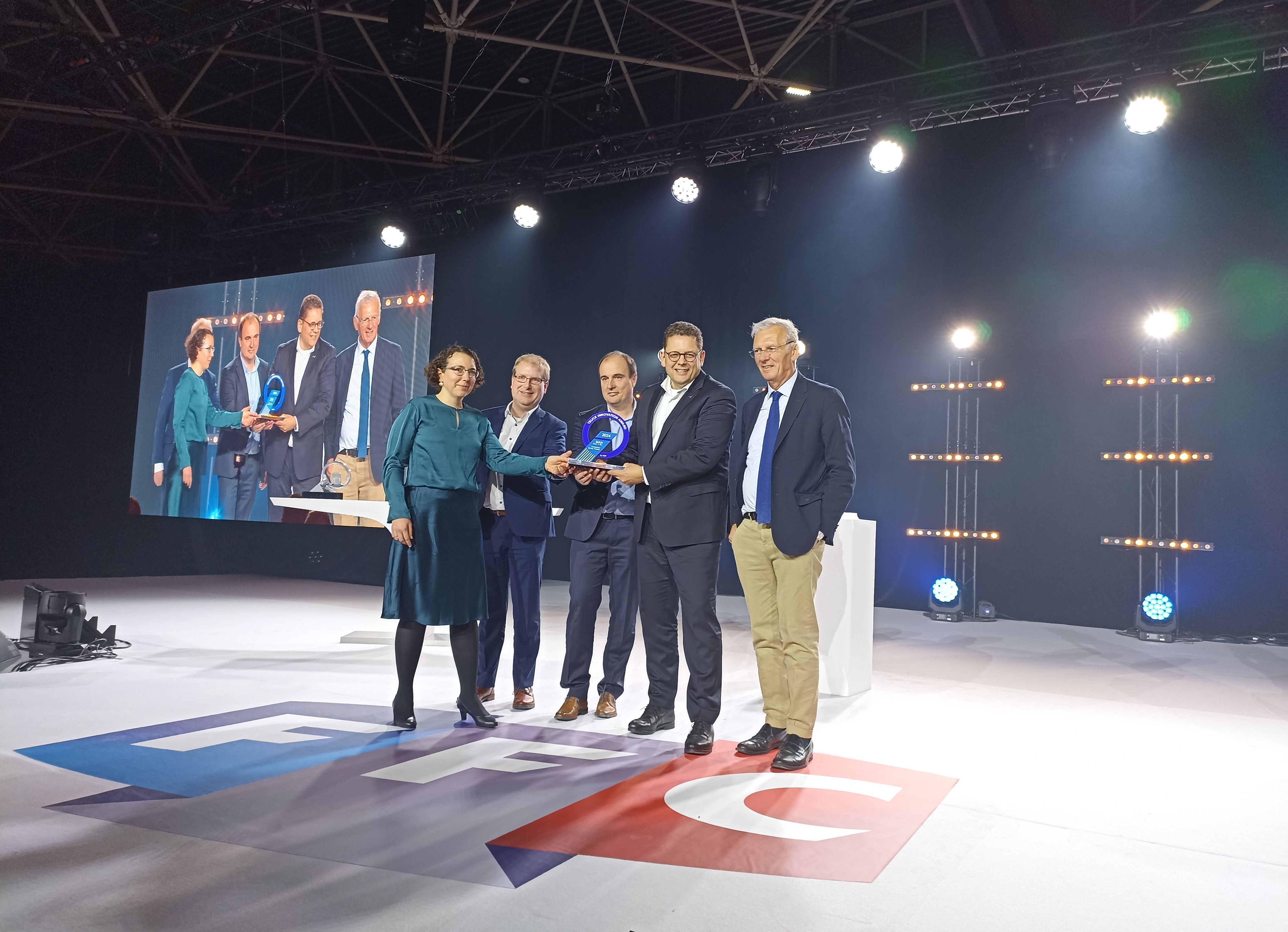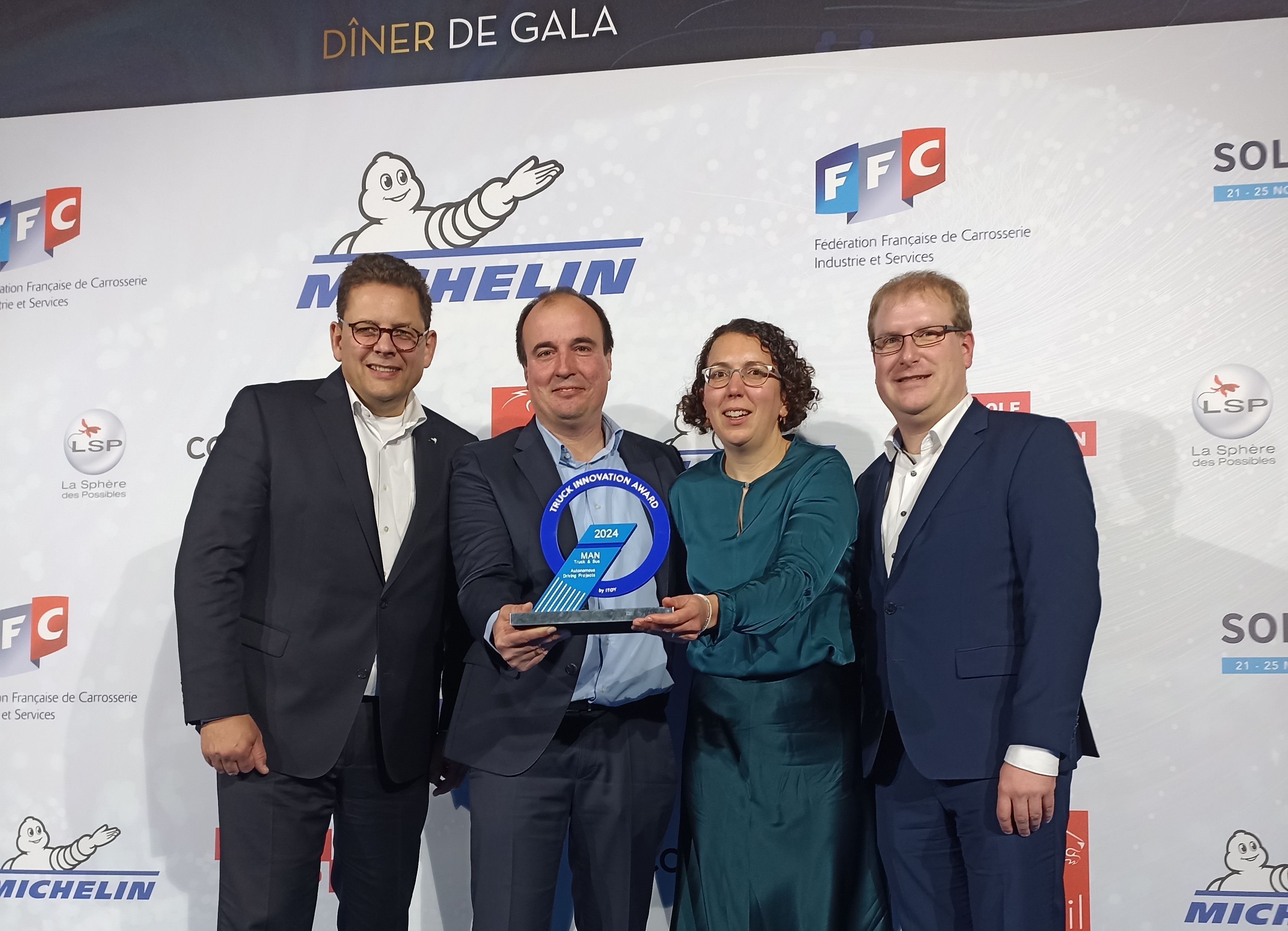 Ceremonia de predare simbolică a premiului Truck Innovation Award 2024 la Solutrans în Lyon: (de la dreapta la stânga) Gianenrico Griffini, Președintele juriului International Truck of the Year, Lukas Walter, Vicepreședinte Senior al Diviziei de Inginerie Truck MAN Truck & Bus, Andreas Zimmermann, Șeful Departamentului de Electrice și Electronică Automatizare Sistem, Amelie Jacquemart-Purson, Șefa proiectului ANITA, Sebastian Völl, Șeful proiectului ATLAS-L4.
