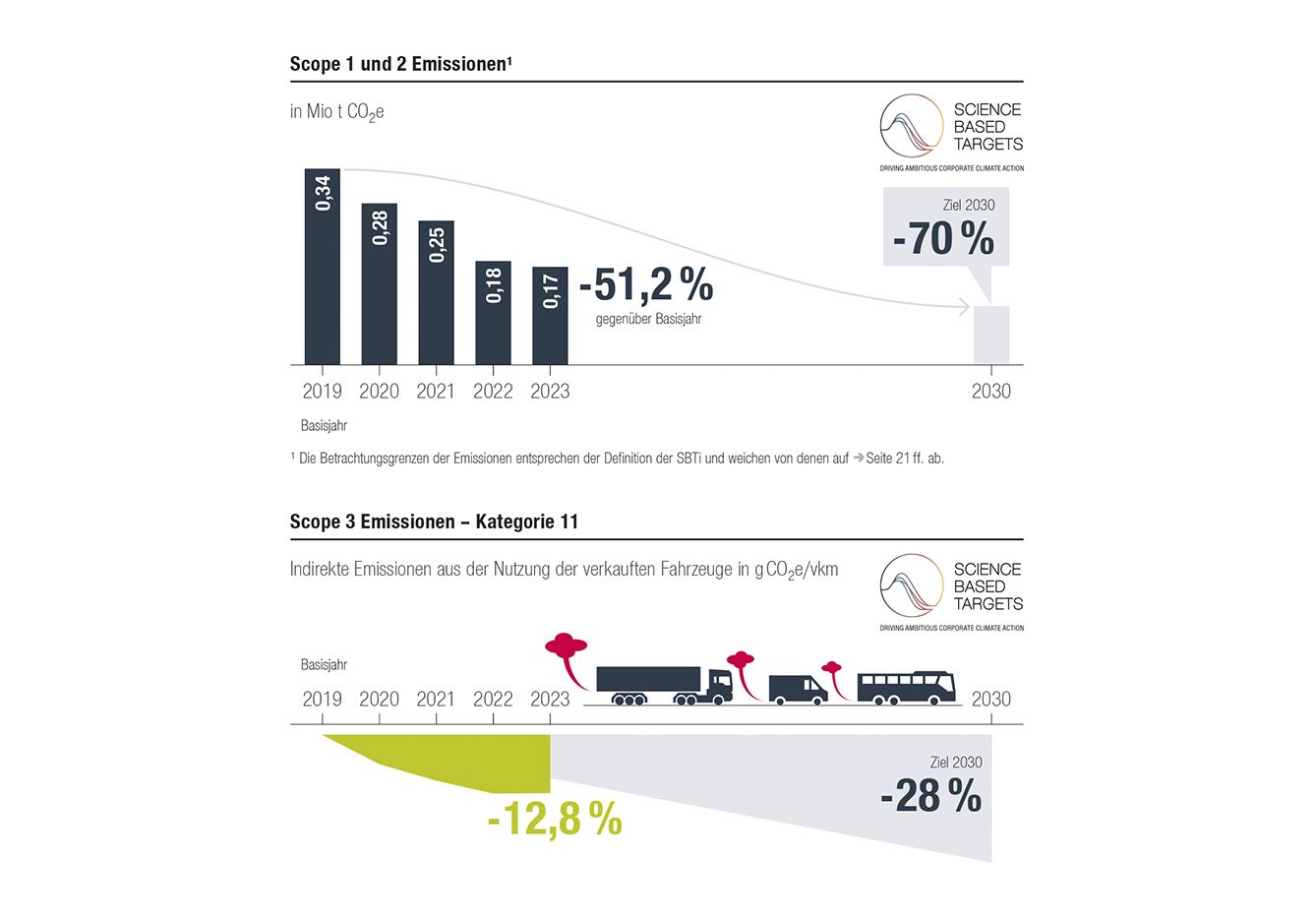Prin aderarea la inițiativa de protecție a climei "Science Based Targets initiative (SBTi)" în 2021, au fost stabilite obiective obligatorii și bazate pe știință pentru reducerea emisiilor de gaze cu efect de seră care dăunează climei: Până în 2030, 70% din emisiile de gaze cu efect de seră (GHG) urmează să fie reduse în locațiile globale ale companiei MAN, comparativ cu anul de bază 2019 (Scope 1 și 2). Până la sfârșitul anului 2023, a fost deja realizată o reducere de 51,2%.