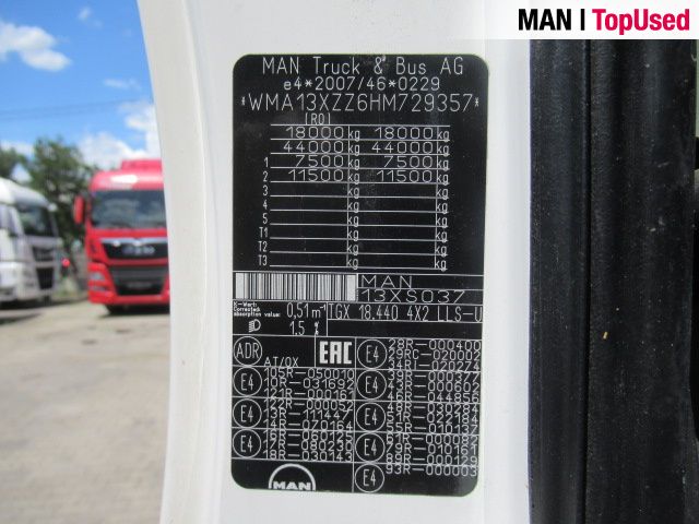 - front air suspension 7.5 t, rear air suspension 11.5 t, hub reduction rear axle Hypoid HY-1350, hypoid axle ratio i 2.53, fuel filter heating, cab insulation NORDIC, cross member for trailer coupling, wiring for tank truck to ADR, ADR Typ AT, equipment for dangerous goods to ADR, type OX, supply kit for semitrailer with lifting axle or moving-off aid, trailer socket 24V (15-pin)