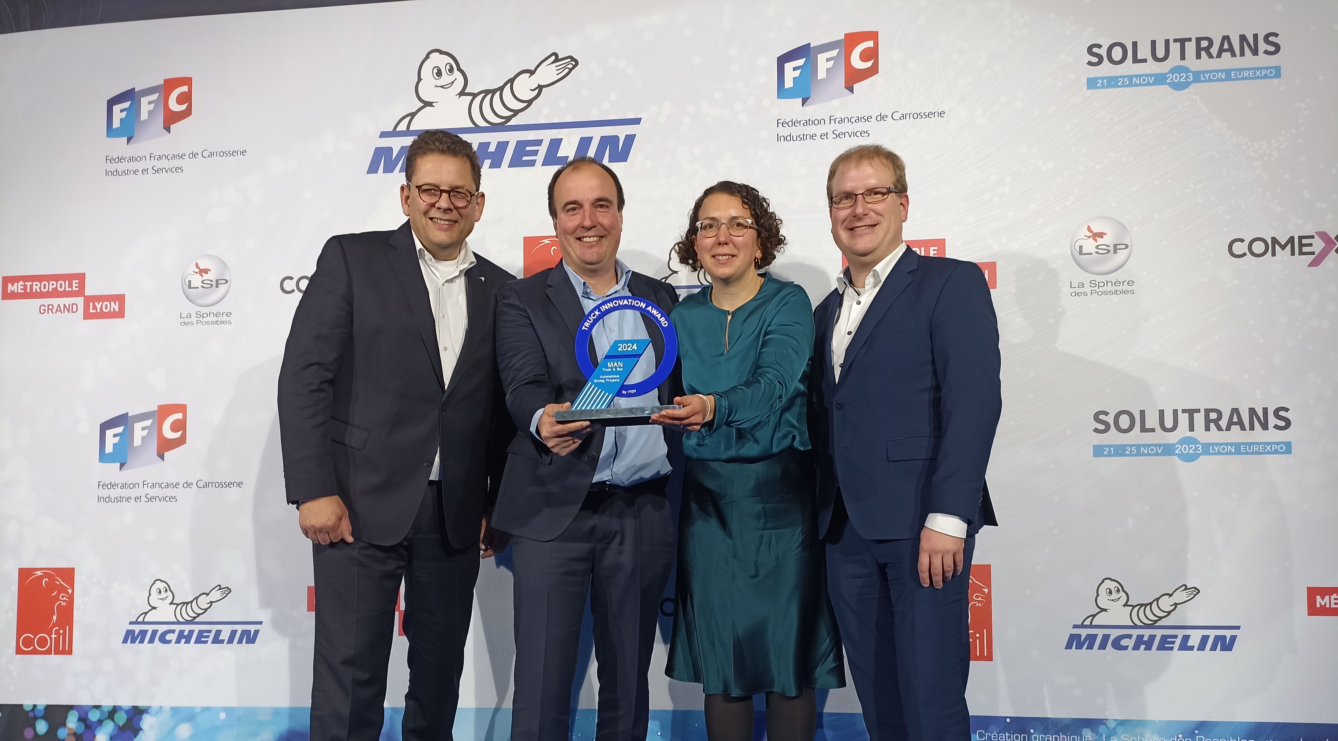 Ceremonia de predare simbolică a premiului Truck Innovation Award 2024 la Solutrans în Lyon: (de la dreapta la stânga) Gianenrico Griffini, Președintele juriului International Truck of the Year, Lukas Walter, Vicepreședinte Senior al Diviziei de Inginerie Truck MAN Truck & Bus, Andreas Zimmermann, Șeful Departamentului de Electrice și Electronică Automatizare Sistem, Amelie Jacquemart-Purson, Șefa proiectului ANITA, Sebastian Völl, Șeful proiectului ATLAS-L4.